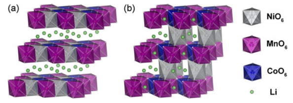 Li(NixCoyMn1-x-y )O2 has structural similarities with LiCoO2. Taking the NCM111 ternary material as an example, Li+ is located at the 3a position in the structure, Ni, Mn, and Co are randomly distributed at the 3b position, and lattice oxygen occupies the 6c position. The transition metal layer structure is composed of Ni, Mn, Co, and is surrounded by 6 lattice oxygens to form a MO6 (M=Ni, Co or Mn) octahedral structure, and lithium ions are inserted between the MO6 layers. During the charging and discharging process, lithium ions are deintercalated in the interlayer structure of MO6, and the electric pairs participating in the electrochemical reaction are Ni2+/Ni3+, Ni3+/Ni4+ and Co3+/Co4+, respectively, while Mn is electrochemically inert and does not contribute to electrochemical reactions. capacity.