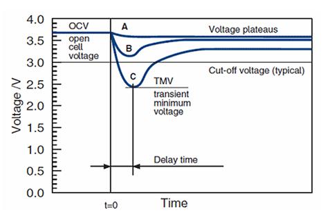 The passivation layer causes a voltage delay when first applying a load to the battery, and Figure 2 illustrates the drop and recovery with batteries affected by different passivation levels. Battery A demonstrates a minimal voltage drop while Battery C needs time to recover.