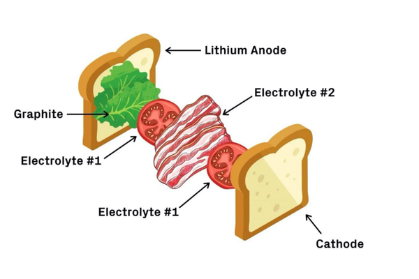 How the battery is designed We can think of the battery as a sandwich. First came the bread: the lithium metal anode, then the lettuce: the graphite coating, next, a layer of tomatoes: the first electrolyte and a layer of bacon: the second electrolyte. Use another layer of tomatoes and the last piece of bread as a cathode.