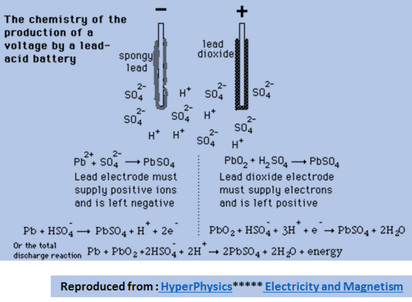 A Lead Acid Battery is constructed with Sponge Lead as its Cathode and Lead Dioxide as its Anode. The electrochemical Cell and the reactions at the Anode and Cathode are illustrated below.